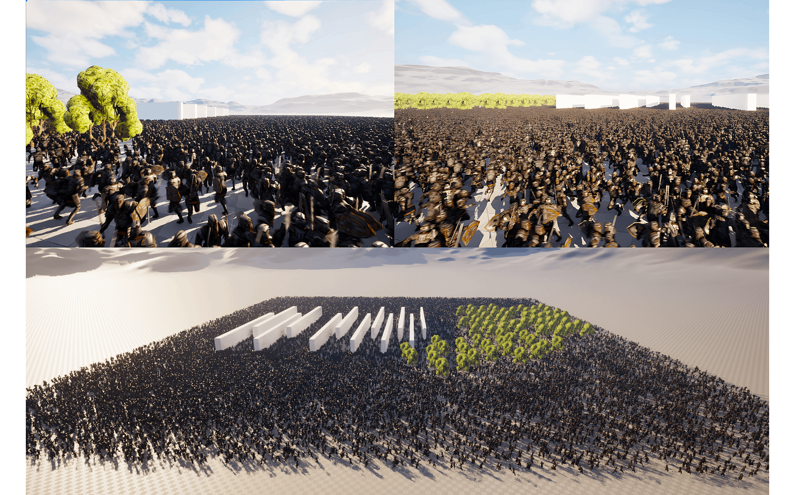 The system chunks game logic, uses multithreading, and processes the workload through dedicated processor-scripts while handling rendering through particle systems and animated static meshes, so each bot can run its own brain, pathfinding, and animation without hurting the framerate.